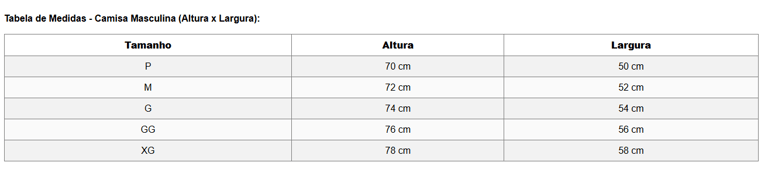 Tamanhos: Todos os tamanhos disponíveis (P, M, G, GG e XG)
